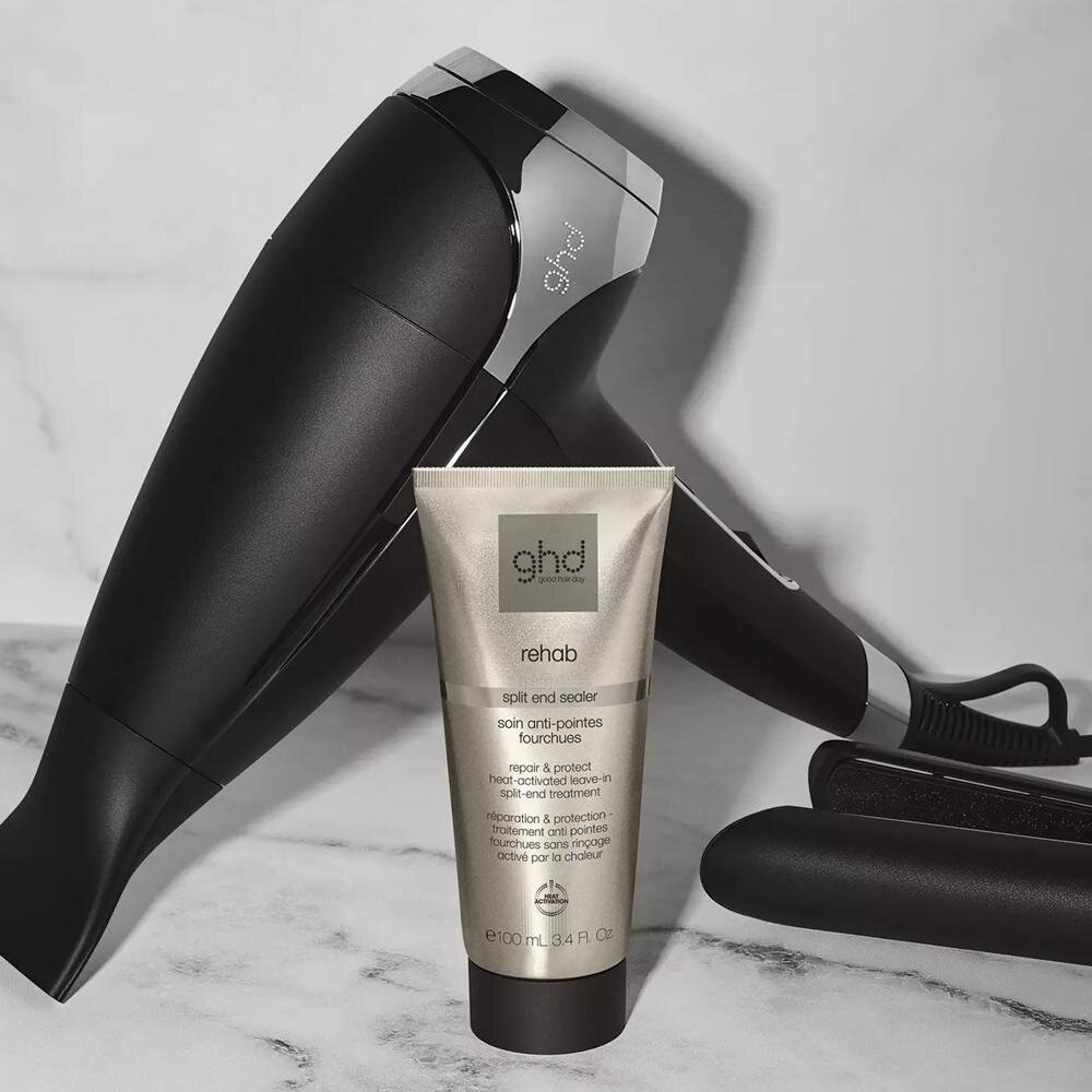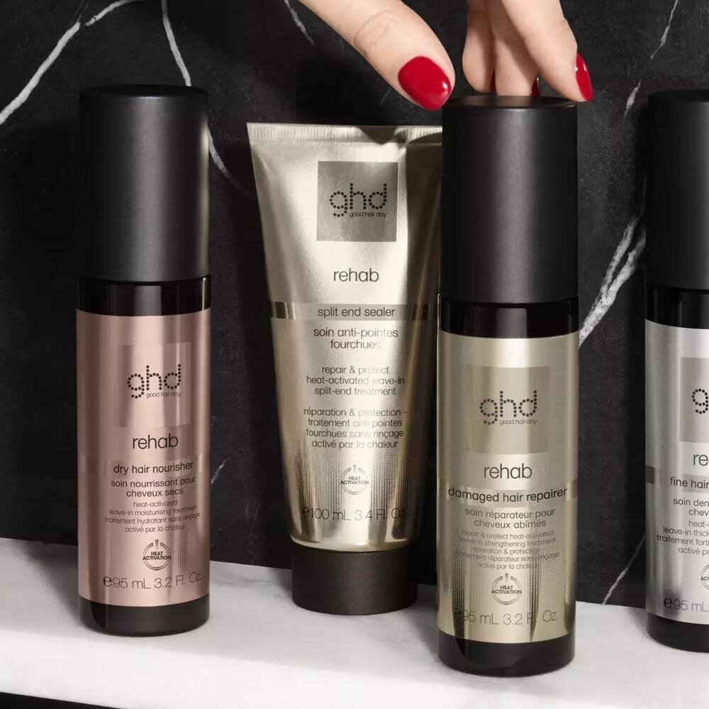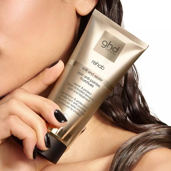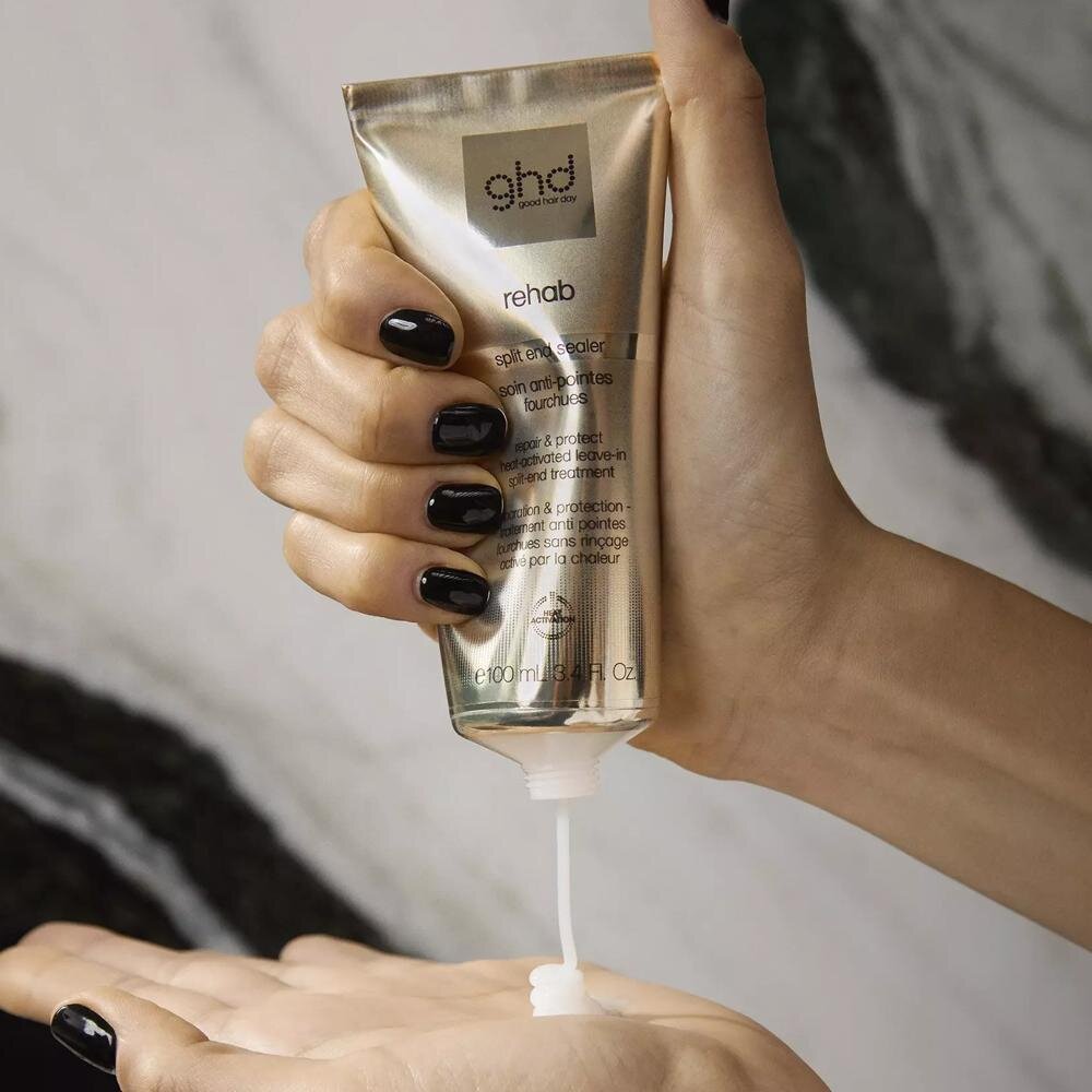 Produkt Rehab GHD sa zameriava na najviac poškodené časti vlasov – končeky. Jeho účinné zloženie pomáha uzatvárať vlasovú kutikulu, čím viditeľne redukuje rozštiepené vlasy a zlepšuje celkový vzhľad účesu.