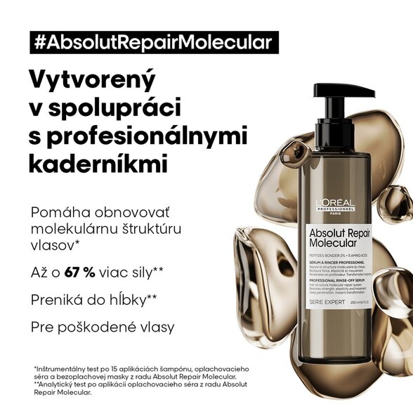 - Acestea pătrund în firul de păr pentru a reconstrui și a repara structura moleculară a părului**. Cu Absolut Repair Molecular, puteți regenera părul grav deteriorat și puteți reda părului rezistența și elasticitatea inițială**, cu o singură utilizare.