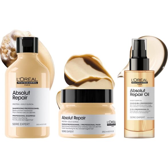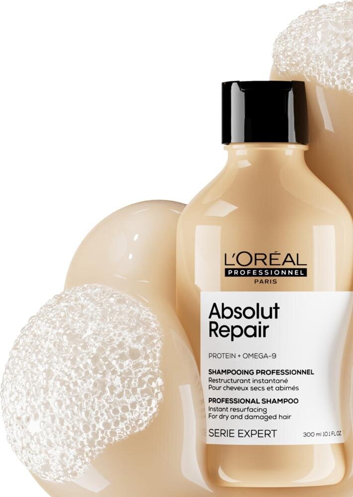 - L'Oréal Professionnel Absolut Repair Șampon pentru păr deteriorat 300 - Bogat în ingrediente hrănitoare, acest șampon profesional curăță instantaneu părul, îndepărtând impuritățile și pregătindu-l pentru îngrijirea ulterioară, întărind în același timp firele de păr, reducând fragilitatea și lăsând părul moale și strălucitor.