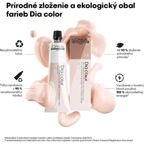 Dia Color sunt creme de colorare alcaline ton pe ton fără amoniac. Formula hibridă care combină natura și tehnologia cu un rezultat excelent. Până la 92% din compoziție de origine naturală* inclusiv ingrediente hrănitoare în profunzime, cum ar fi untul de shea care oferă nutriție, propanediol (un ingredient derivat din uleiuri vegetale regenerabile sau porumb) și glicerină pentru hidratare, precum și acid hialuronic, cunoscut pentru proprietățile sale hidratante. Restul de 8% din compoziție garantează eficacitatea culorii, durabilitatea produsului și stabilitatea rezultatului.