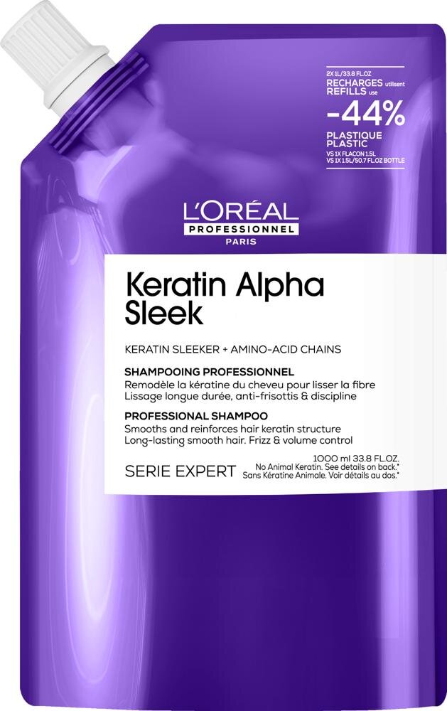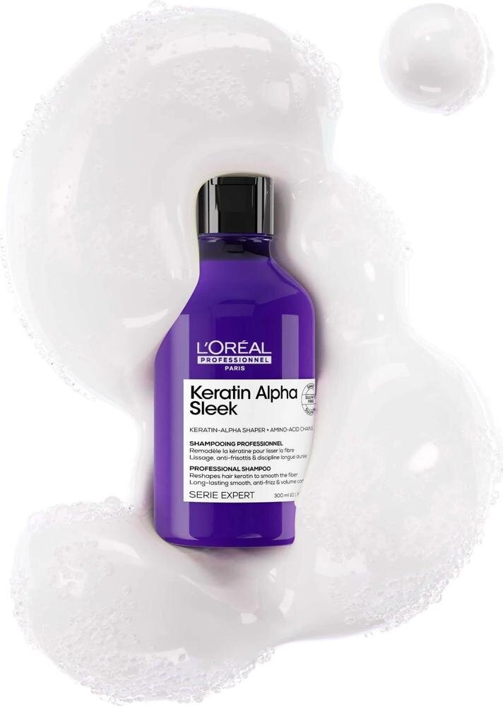 L'Oréal Professionnel Keratin Alpha Sleek șampon netezitor pentru părul creț este un șampon profesional pentru păr dezvoltat special pentru părul predispus la electrizare, volum excesiv și textură rebelă. Este un șampon modern de netezire a părului, care ajută la restabilirea controlului asupra fibrei capilare chiar și în timpul spălării. Părul este după utilizare mai neted, mai disciplinat și pregătit pentru o coafare mai ușoară, fără electrizare excesivă.