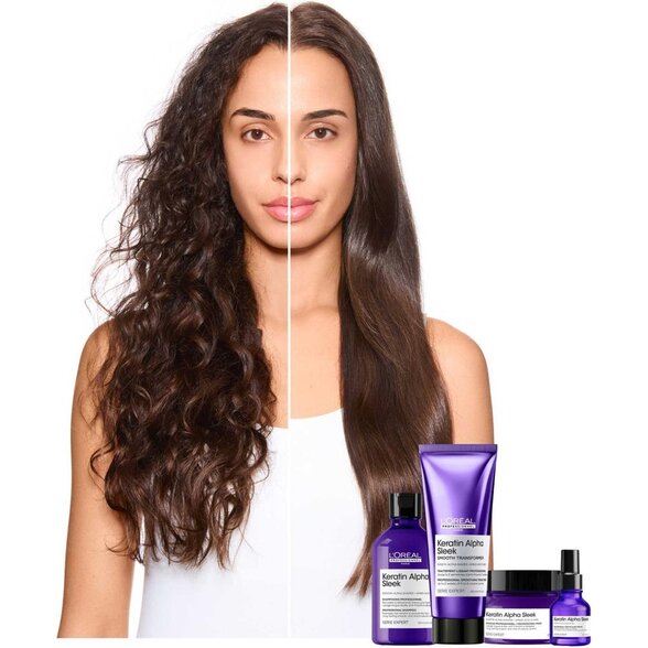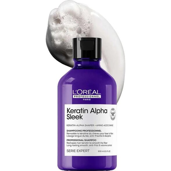L'Oréal Professionnel Keratin Alpha Sleek șampon netezitor pentru părul rebel este un șampon profesional pentru păr, dezvoltat special pentru părul predispus la electrizare, volum excesiv și textură indisciplinată. Este un șampon modern pentru netezirea părului, care ajută la restabilirea controlului asupra fibrei capilare chiar în timpul spălării. Părul este mai neted, mai disciplinat și pregătit pentru o coafare mai ușoară, fără electrizare excesivă.