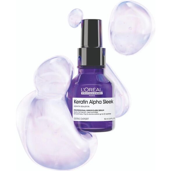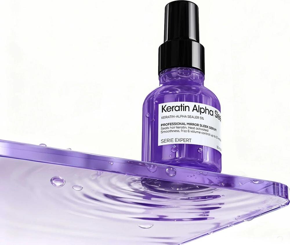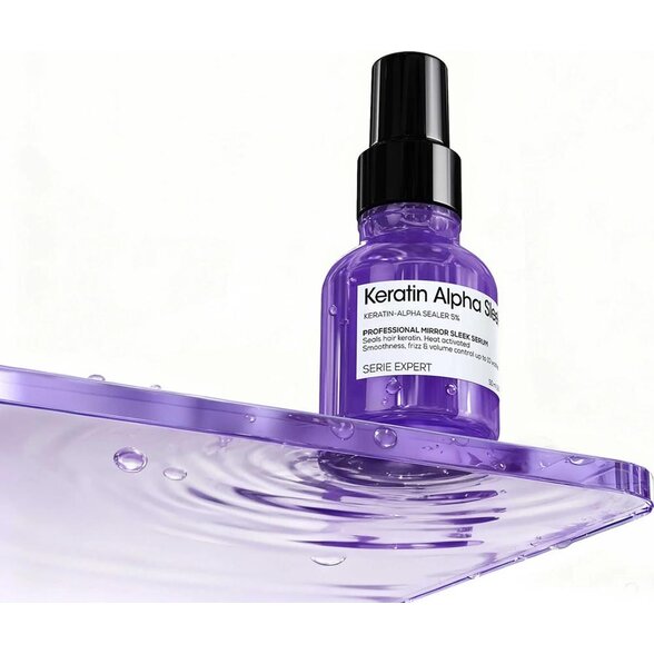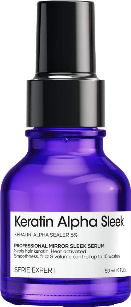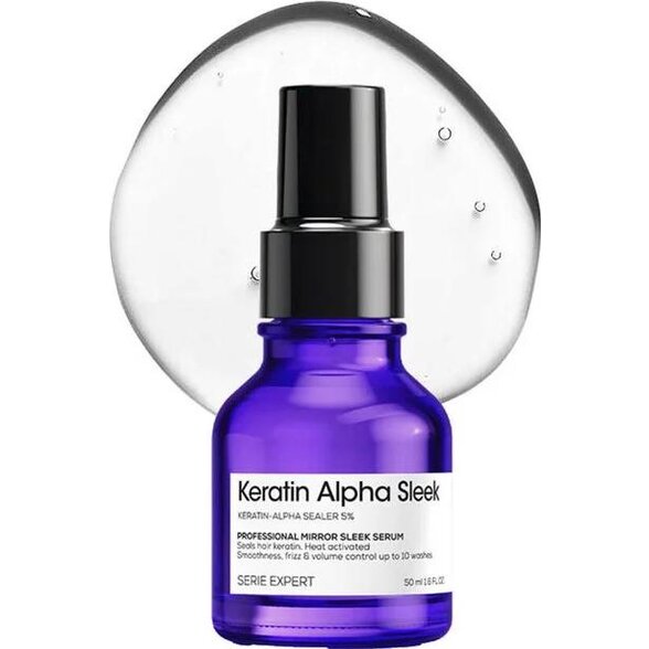 L'Oréal Professionnel Keratin Alpha Sleek serum creează pe păr o peliculă protectoare, care ajută la protejarea părului de umiditate până la 80% din umiditatea din aer. Datorită acestui lucru, părul rămâne neted, disciplinat și aranjat chiar și în condiții climatice dificile.