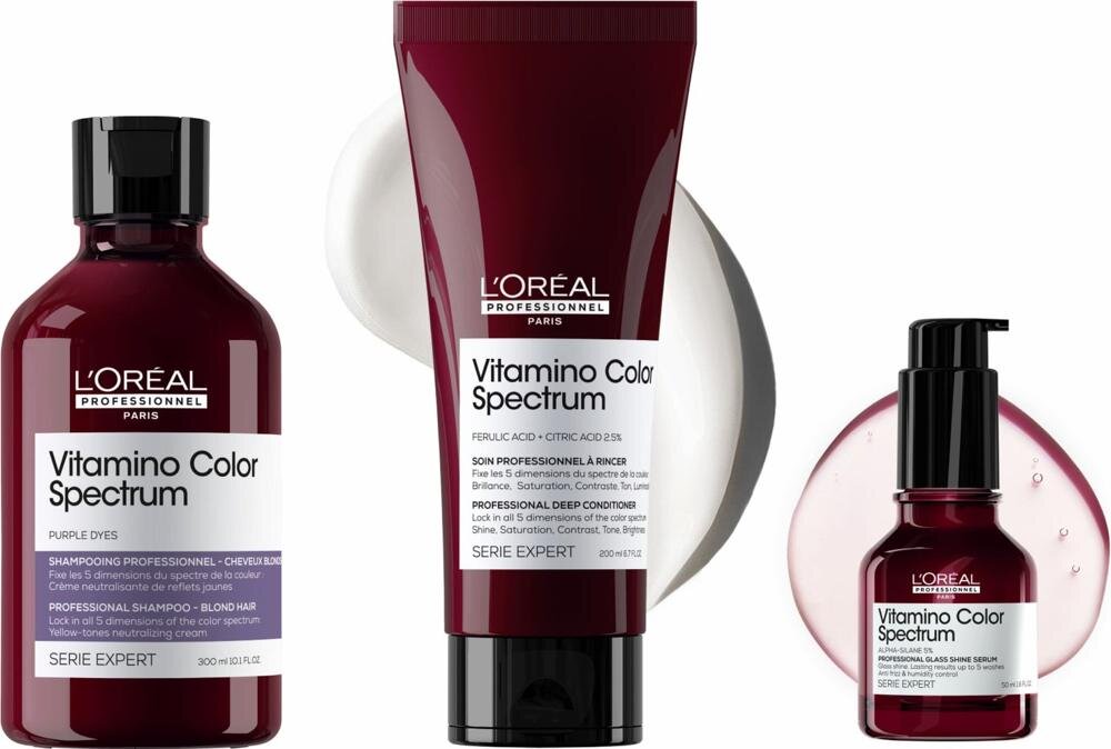 - Vitamino Color Spectrum Glass Shine Serum: Ser fără clătire, care conferă părului strălucire și netezime instantanee.