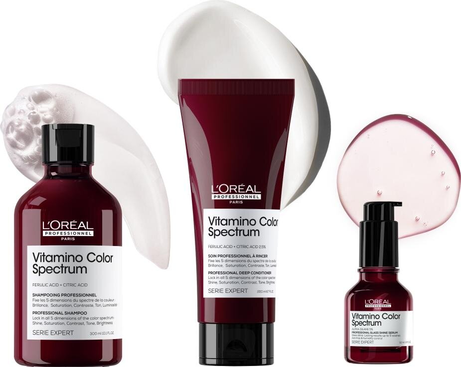 • Vitamino Color Spectrum Glass Shine Serum: Ser fără clătire, care conferă părului strălucire și netezime instantanee.