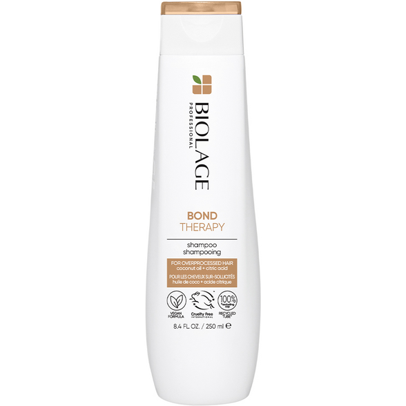 Biolage Bond Therapy sampon pentru parul deteriorat si suprasolicitat. Consolidează legăturile din par. Imbogatit cu ulei de cocos si acid citric. Hrănește părul și consolidează legările puternic deteriorate, lăsând părul mai puternic, mai moale și intens hrănit, fără a-l încarca.