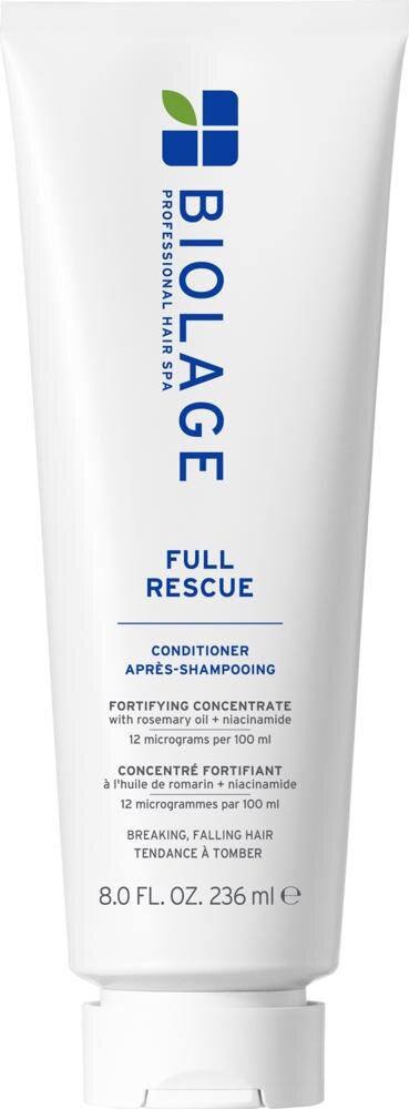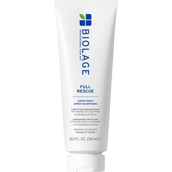 Biolage Full Rescue este un balsam profesional special conceput pentru părul fin, slab și fragil. Este ideal pentru cei care doresc un păr mai gros, o creștere mai rapidă a părului și o îmbunătățire a calității generale a scalpului. Conține niacinamidă (vitamina B3) și ulei de rozmarin, care sunt cunoscute pentru întărirea părului de la rădăcină.
