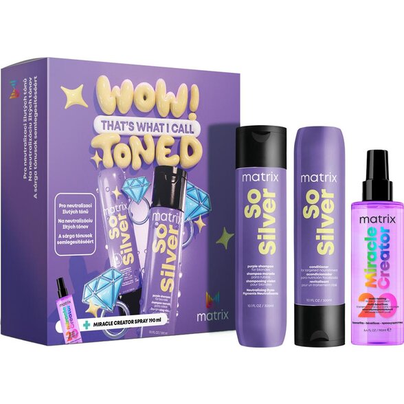 Setul combină trei produse emblematice – șamponul So Silver Purple, balsamul So silver Purple și spray-ul multifuncțional universal Miracle Creator – pentru a oferi o îngrijire completă care neutralizează părul cu tonuri calde, protejează și lasă părul neted, strălucitor și plin de viață