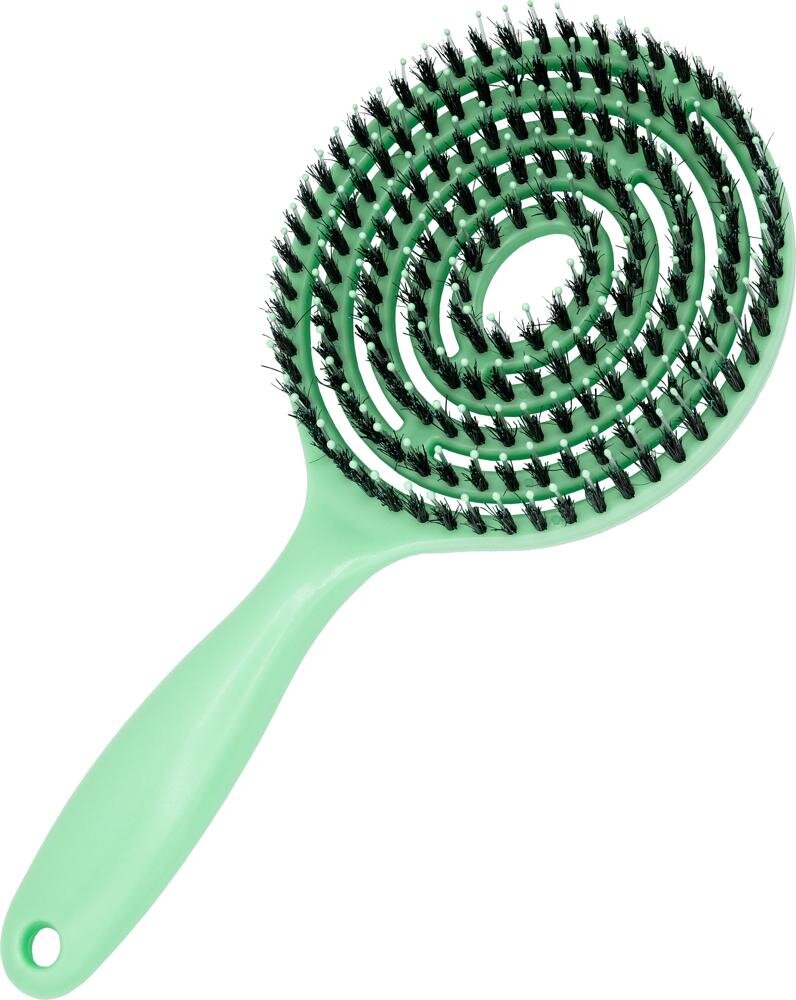 • Combinație de peri de mistreț și nailon – perii naturali netezesc firul de păr, în timp ce vârfurile din nailon facilitează pătrunderea periei în firele mai dense și împiedică tragerea.