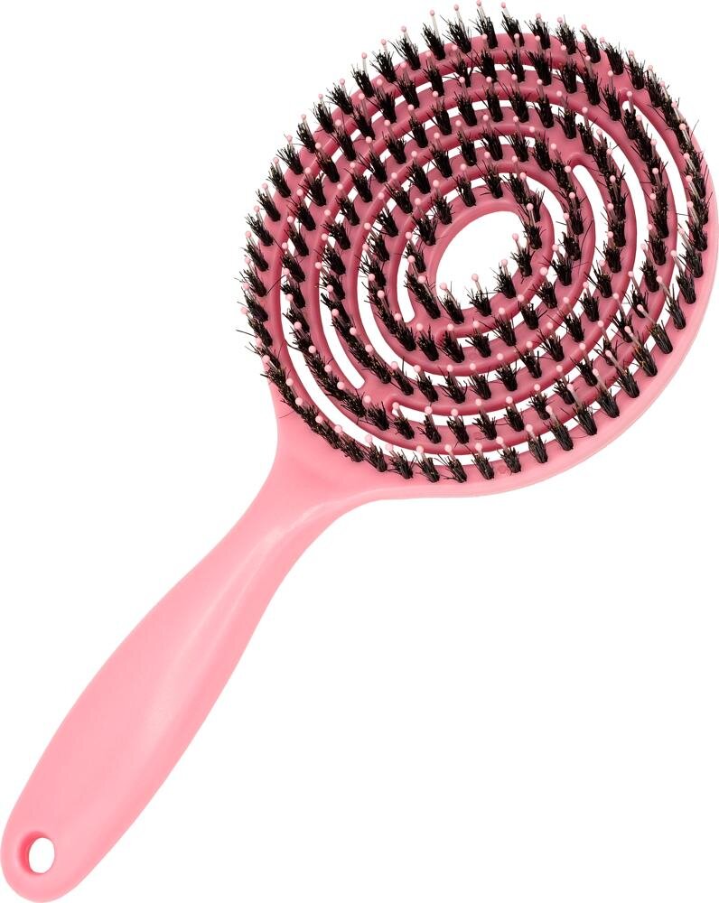 • Combinație de peri de mistreț și nailon – perii naturali netezesc firul de păr, în timp ce vârfurile din nailon facilitează pătrunderea periei în firele mai dense și împiedică tragerea.