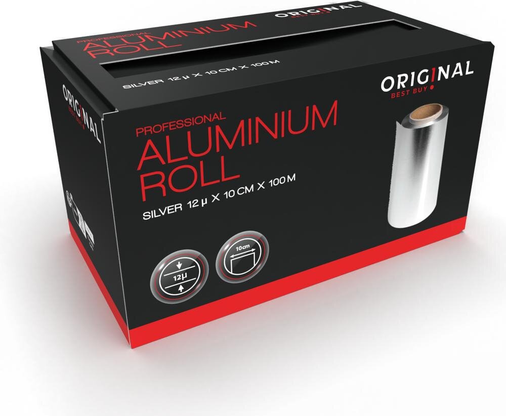 Hliníková strieborná melírovacia fólia v kotúči s hrúbkou 12μ, dodávaná v krabičke.