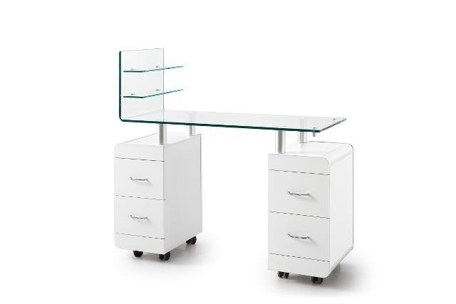 Praktický stôl na manikúru z tvrdeného skla s 2 poličkami. Stôl je pevne namontovaný na 2 vozíkoch s...