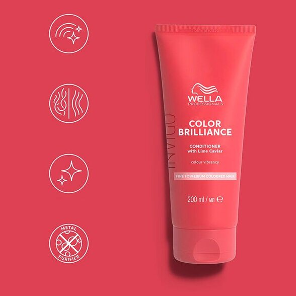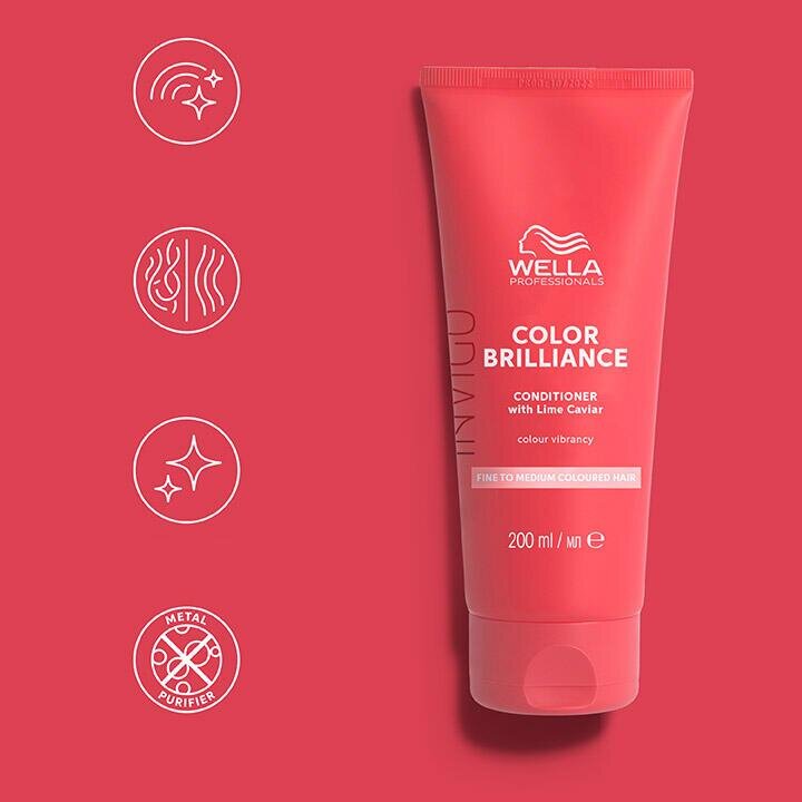 Balsamul Wella Professionals Invigo Color Brilliance a fost creat special pentru părul vopsit, fin și normal, care are nevoie de nutriție intensă, protecție a culorii și ușurință. Datorită formulei sale avansate cu caviar de lime, vitamina E și tehnologia Metal Purifier, acest balsam asigură că culoarea dvs. rămâne strălucitoare și de lungă durată, lăsând părul moale, strălucește și este frumos neted.