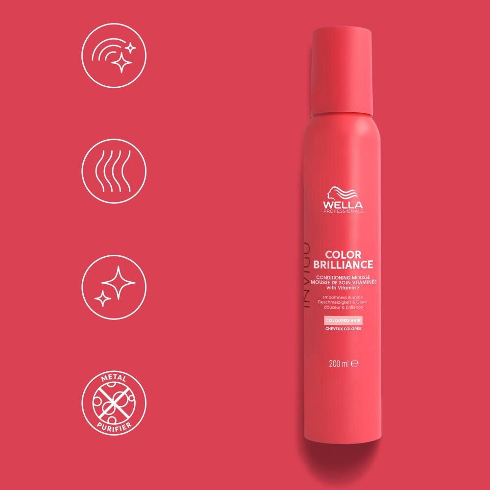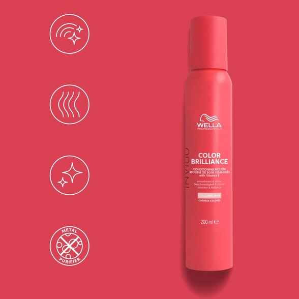 Spuma de păr profesională Wella Professionals din gama Wella Professionnels, care îmbogățește, conferă strălucire și protejează culoarea într-un singur pas Invigo Color Brilliance Balsamul de fixare a culorii este ideal pentru toate tipurile de păr vopsit sau colorat care doresc o culoare vizibil mai bogată, mai elastică și de lungă durată. Este conceput nu numai pentru a întări și a modela coafura, ci și pentru a proteja în mod activ culoarea împotriva decolorării și a factorilor externi dăunători.