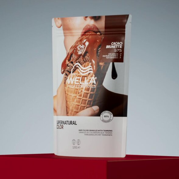 Brun închis cacao, cu rezultat profesional - Wella Professionals Supernatural Color 5/75 Cacao Brunette prezintă un castaniu modern deschis-mahagon, care combină compoziția naturală cu tehnologia de salon precisă. Datorită proporției mari de ingrediente de origine naturală și a rețetei vegane, este alegerea ideală pentru clientele care doresc o culoare maro intensă, dar cu aspect natural.