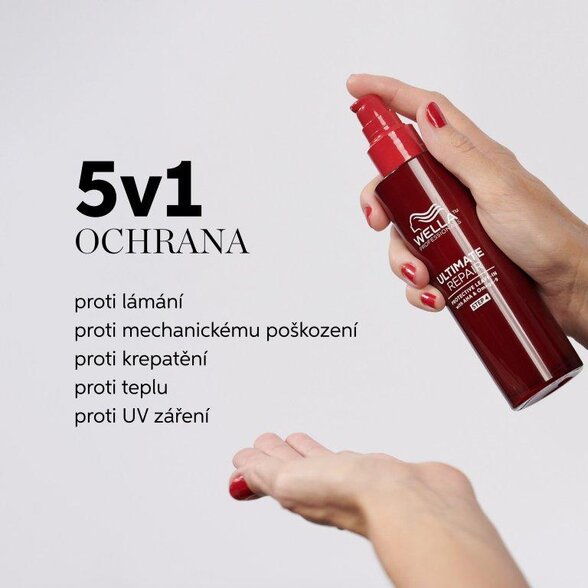 Spray-ul de păr fără clătire Wella Professionals Ultimate Repair Protective oferă protecție împotriva celor mai frecvente 4 cauze ale deteriorării părului, reducând în același timp ruperea părului. Textura lăptoasă a produsului Wella Ultimate Repair Protectiv fără clãtire se absoarbe rapid, lăsând părul vizibil mai neted, mai sănătos și mai elastic. Spray-urile sunt potrivite pentru toate tipurile de păr, inclusiv pentru părul cret.